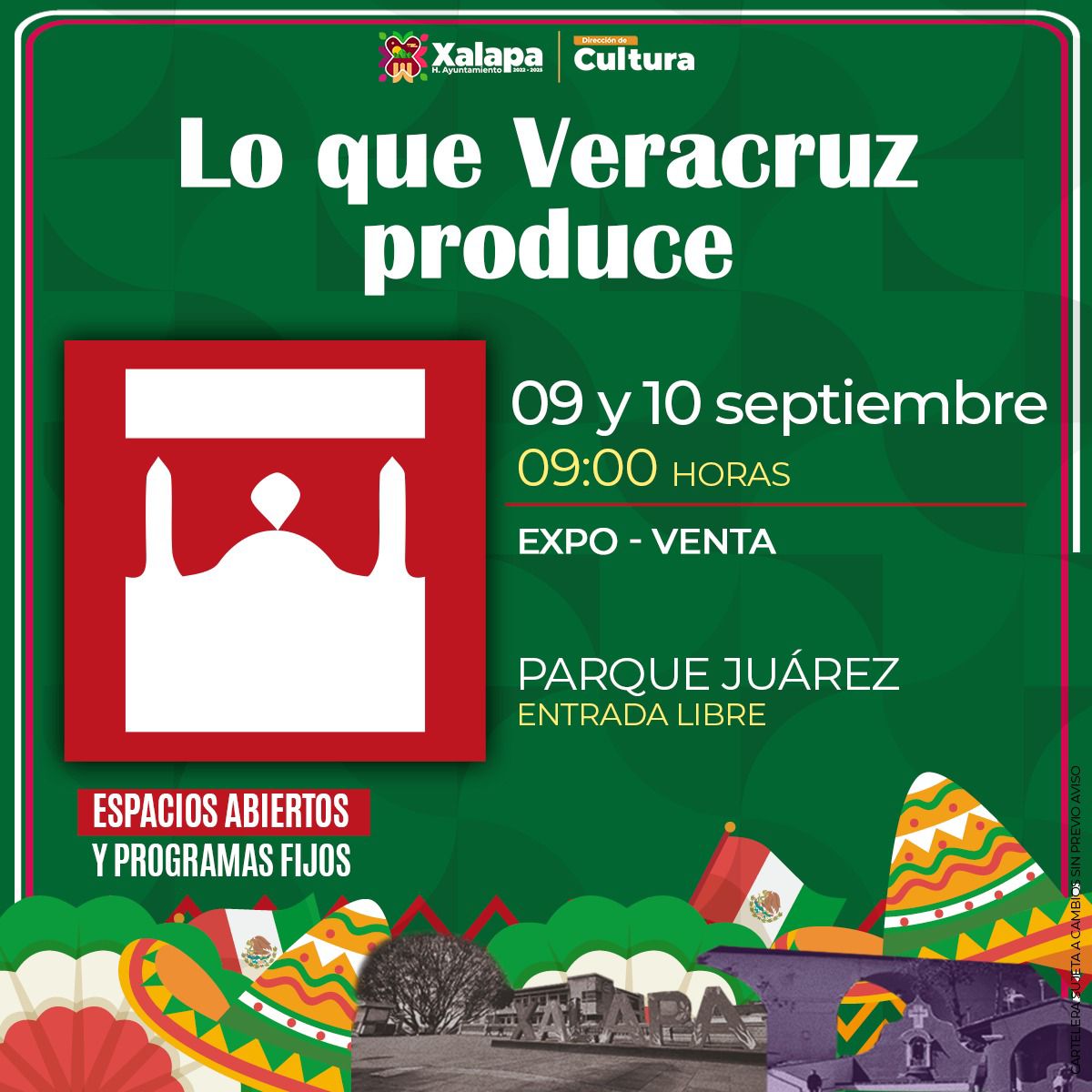 El 9 y 10 de septiembre, se desarrollará la Expo- Venta “Lo que produce Veracruz”, en el parque Juárez a partir de las 9:00 horas; y el 10 a las 12:00 horas en el Teatro J.J. Herrera, será la clausura de 'La Festa Antiqua", a cargo del Ensamble de Música Antigua Corazón con Manos y su concierto “Cruzada Vol. 3”.